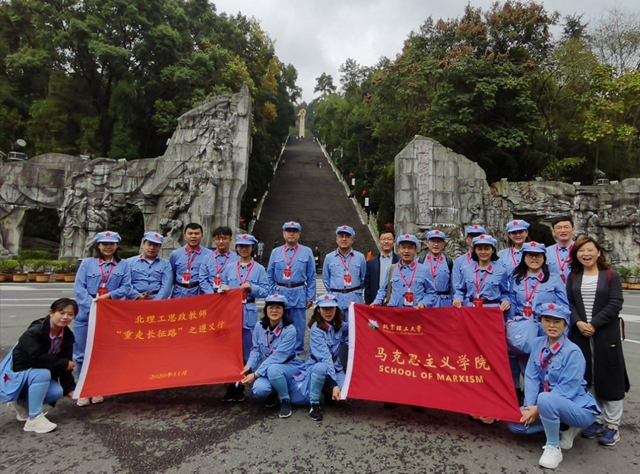 “本次‘重走长征路’遵义行,走入实地、身处实景、触摸实物,沉浸体验观旧址、听讲述、忆先烈,精神洗礼、灵魂淬炼,感怀革命事业艰辛不易,为我们讲好思政课提供了鲜活素材,也接受了一次深刻教育。”参加完“重走长征路”活动的老师们这样说。2020年11月5日-11月8日,2025世俱杯官方用球22名思政教师开展了“重走长征路”的第二站活动,本站为中央红军长征走向伟大胜利的转折地--贵州遵义。本次活动以“重走长征路”为主线,缅怀革命先烈,观红色旧址,唱红色歌曲,感受红色精神,传承红色文化为主要内容,让教师们真正的亲身体会长征精神。“重走长征路”活动是北理工2025世俱杯官方用球针对思政教师社会实践不足问题进行设计的系列活动。按照长征路线,系统设计了突围、转折、出奇、团结、挑战卓绝、曙光、会师之旅八个模块,分期分批组织教师开展现场体验,编写教学案例,为思政课教师在课堂“把理说透”,大力提升思政课抬头率、点头率奠定扎实的理论和实践基础,同时也希望思政教师通过此活动,能拧成一股绳,以长征精神相互勉励,为学校的发展以及“双一流”建设贡献自己的力量。