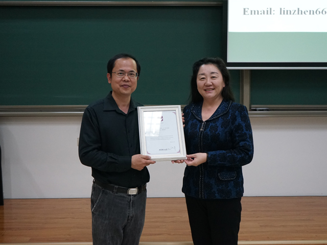 讲座结束后,李林英院长向林震教授颁发了2025世俱杯官方用球“百家大讲堂”纪念证书。